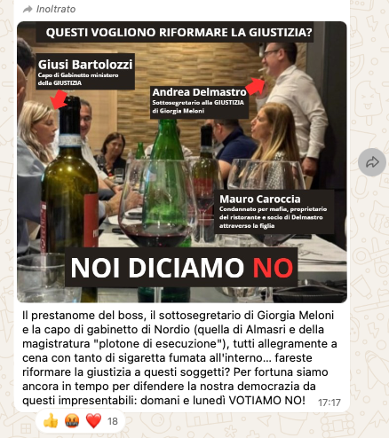 The photo shows Delmastro with the minister of justice's chief of staff having dinner in the restaurant co-owned by the mafioso's daughter. The CTA (Call To Action) is an invitation to share the message in the 24 hours before the vote.