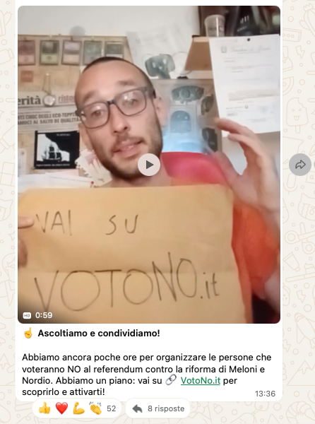 Giorgia Meloni’s defeat in the March 23 referendum on judicial reform in Italy was widely seen as a political setback for the prime minister, signaling resistance to key elements of her agenda and revealing a wide gap between her government’s priorities and broader public sentiment. One key element behind this result was the strong turnout. Digital expert Lorenzo Azzolini explains how a civil-society-driven digital campaign on WhatsApp helped achieve this – demonstrating how personal contacts and direct exchanges can make all the difference by amplifying messages exponentially.